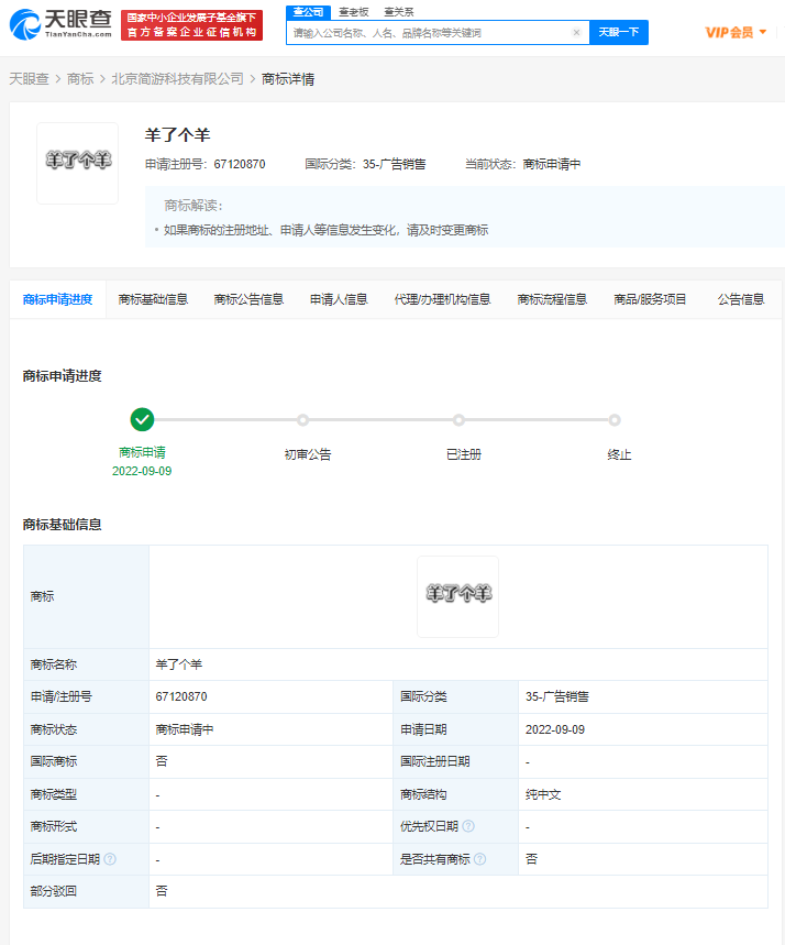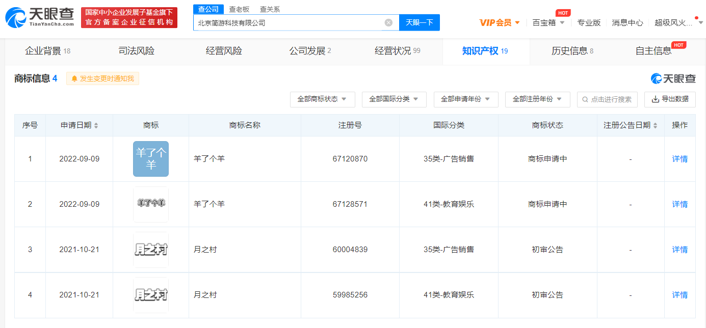 鞭牛士 9月19日消息,天眼查App显示,近日,《羊了个羊》开发公司北京简游科技有限公司申请注册2枚“羊了个羊”商标,国际分类为教育娱乐、广告销售,当前商标状态均为申请中。