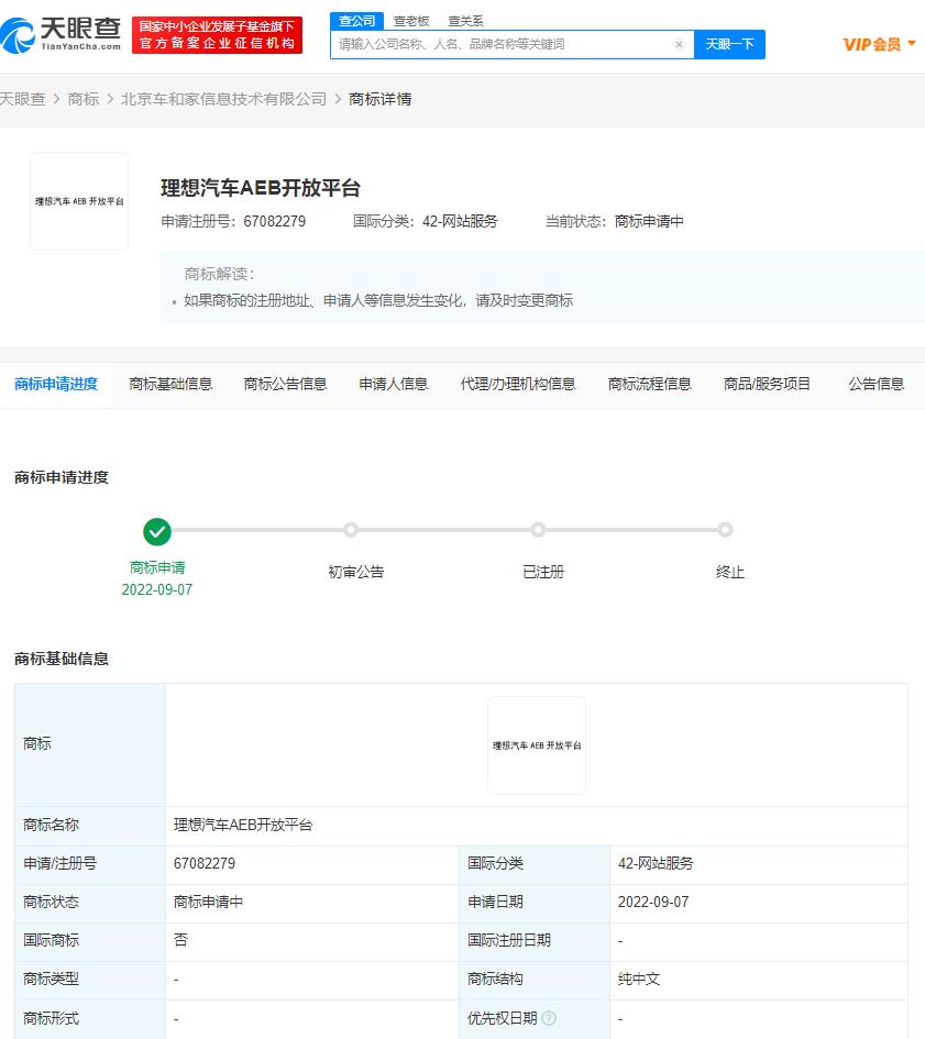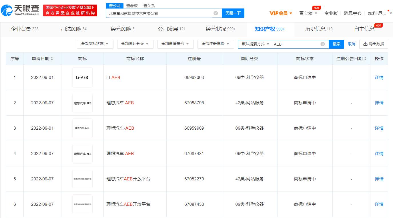 鞭牛士 9月23日消息,天眼查App显示,近日,理想汽车关联公司北京车和家信息技术有限公司申请注册多条“理想汽车AEB开放平台”“理想汽车 AEB”“Li-AEB”商标,国际分类包括科学仪器、网站服务,当前商标状态均为申请中。
