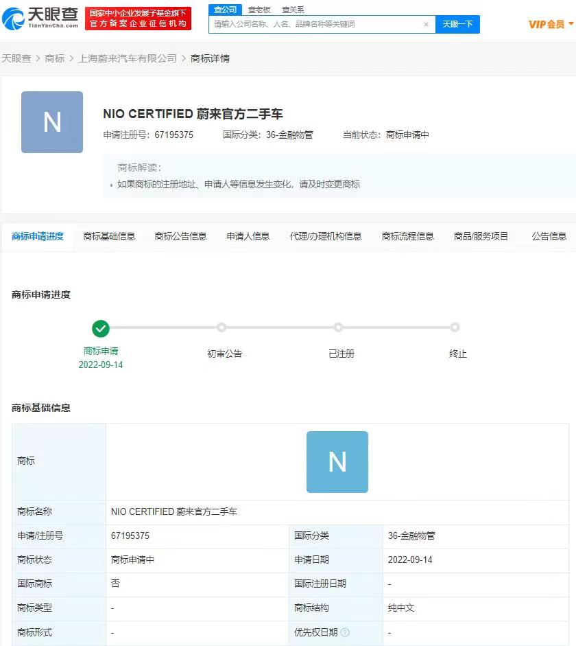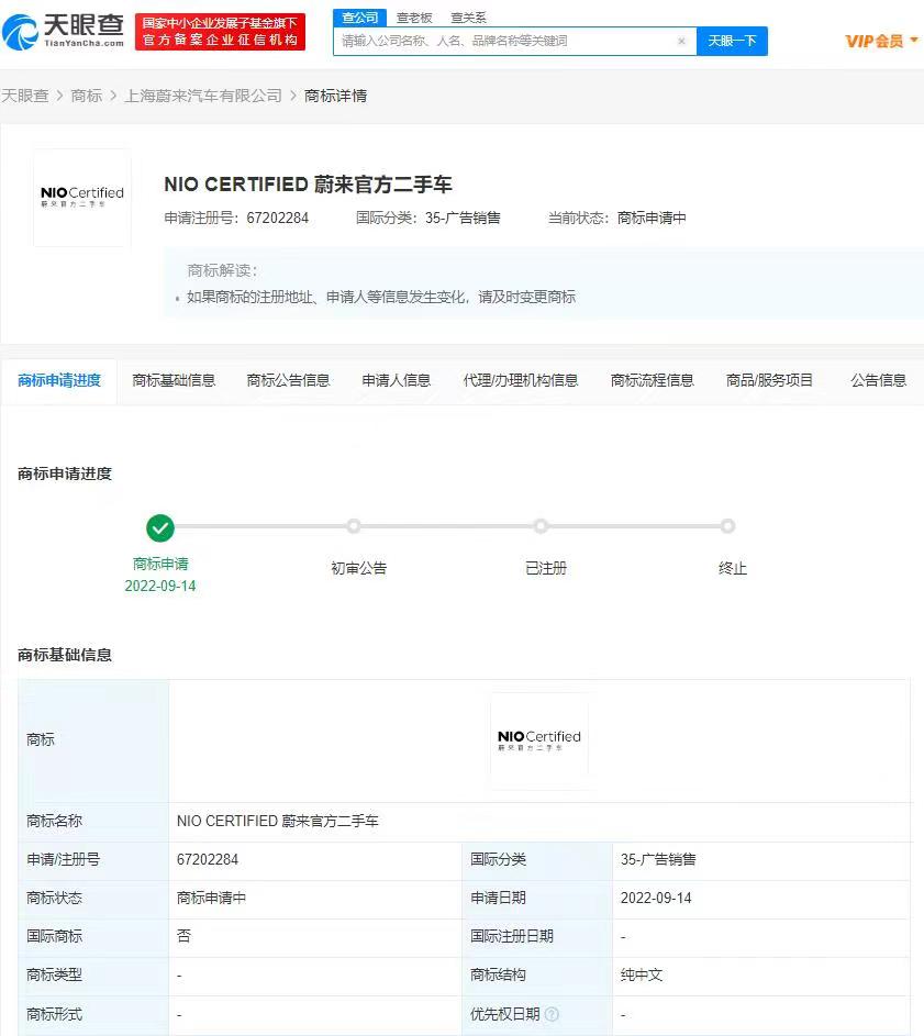鞭牛士 9月27日消息,天眼查App显示,近日,上海蔚来汽车有限公司申请注册“NIO CERTIFIED 蔚来官方二手车”商标,国际分类包括金融物管、网站服务、广告销售,目前商标状态均为申请中。