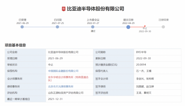 鞭牛士 10月3日消息,9月30日,深交所披露,比亚迪半导体股份有限公司(以下简称“比亚迪半导体”)因IPO注册申请文件中记载的财务资料已过有效期,需要补充提交,根据《创业板首次公开发行股票注册管理办法(试行)》第二十九条的相关规定,其发行注册程序中止。