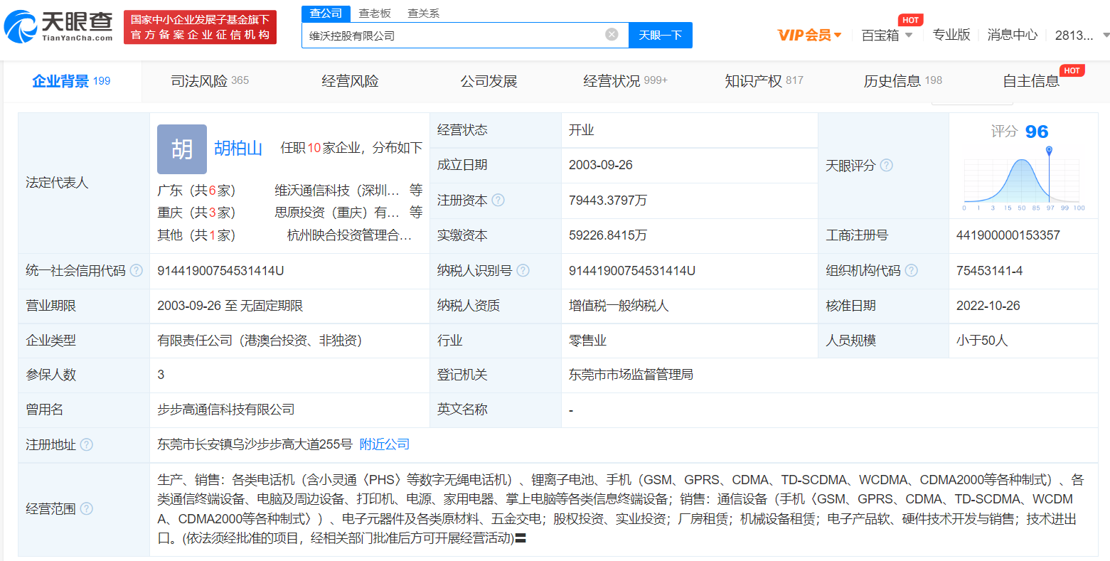 该公司成立于2003年9月,法定代表人为胡柏山,经营范围含生产、销售:各类电话机、锂离子电池、手机、各类通信终端设备、电脑及周边设备等。