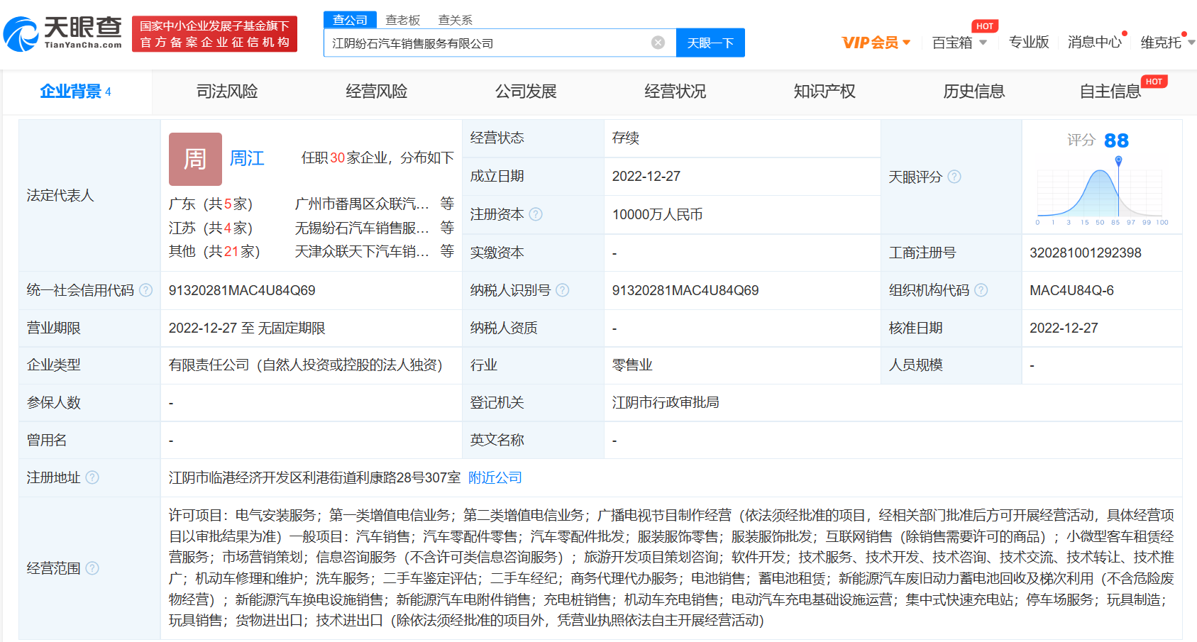 鞭牛士 1月3日消息,天眼查App显示,近日,江阴纷石汽车销售服务有限公司成立,法定代表人为周江,注册资本1亿人民币,经营范围包括汽车销售;汽车零配件零售;汽车零配件批发;互联网销售;电池销售;蓄电池租赁等。