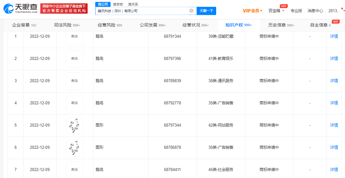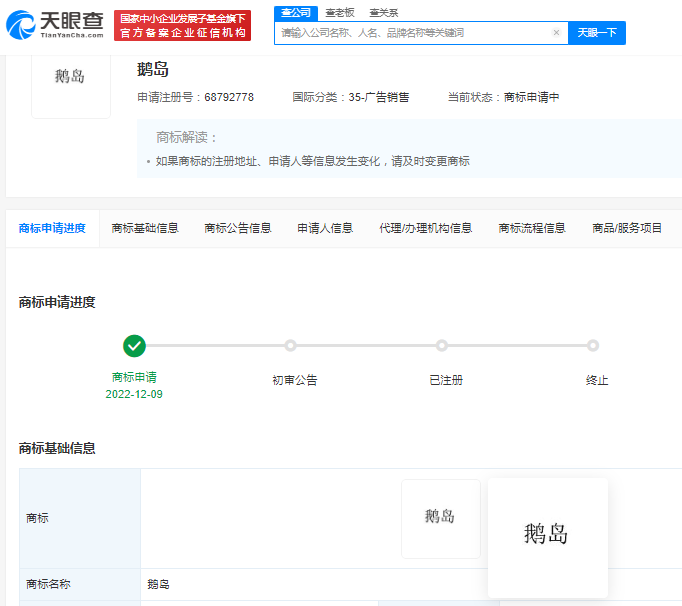 鞭牛士 1月9日消息,天眼查App显示,近日,腾讯科技(深圳)有限公司申请注册多个“鹅岛”商标,国际分类涉及教育娱乐、广告销售、社会服务、运输贮藏等,当前商标状态均为申请中。