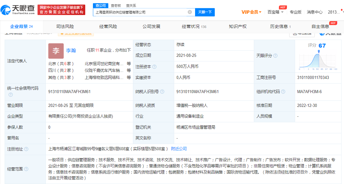 上海星辰跃动供应链管理有限公司成立于2021年8月,法定代表人为李瀚,经营范围含供应链管理服务;软件开发;普通货物仓储服务;国内货物运输代理等,由上海格物致远网络科技有限公司全资持股,后者为抖音集团(香港)有限公司全资子公司。