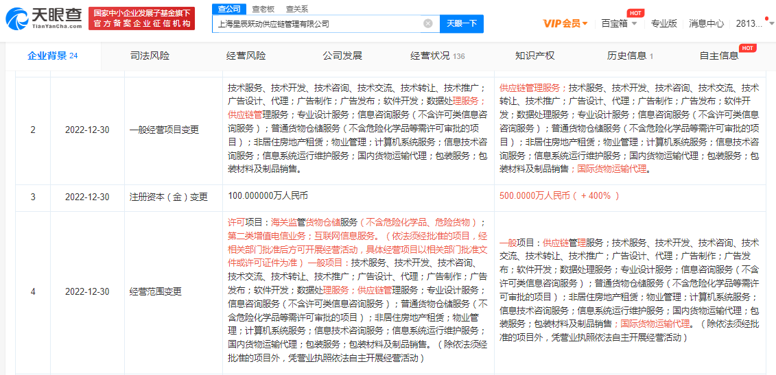 鞭牛士 1月9日消息,天眼查App显示,近日,上海星辰跃动供应链管理有限公司发生工商变更,注册资本由100万人民币增至500万人民币,增幅达400%;同时公司经营范围新增国际货物运输代理。值得一提的是,不久前,其母公司上海格物致远网络科技有限公司也进行增资,注册资本由100万人民币增至1亿人民币。