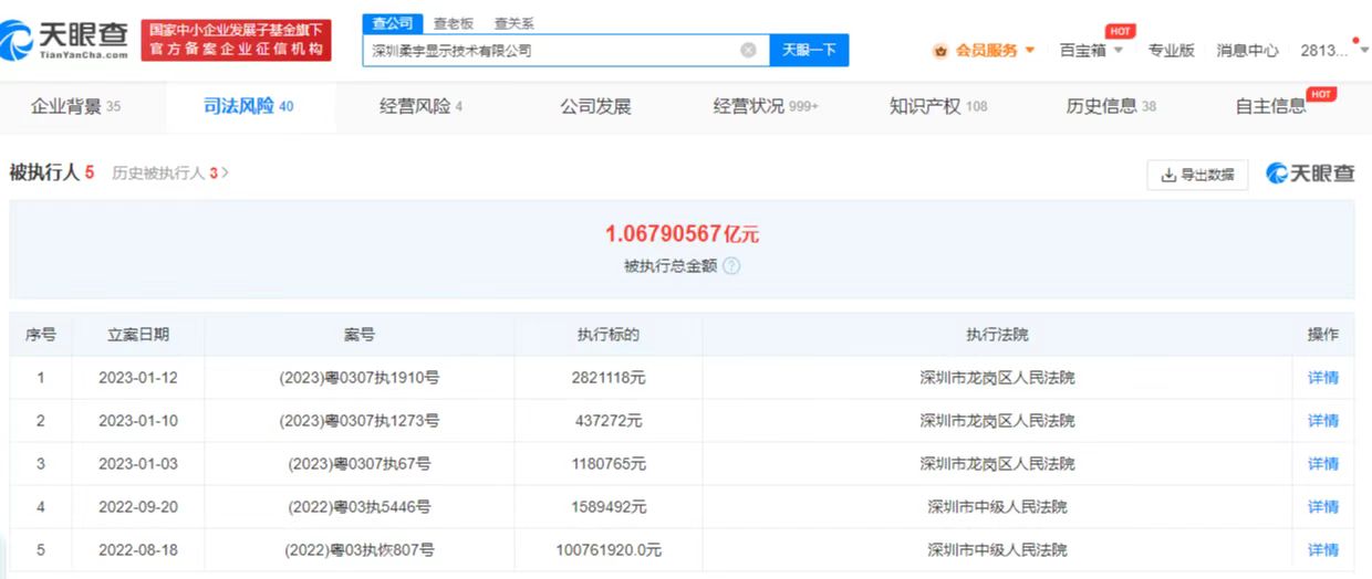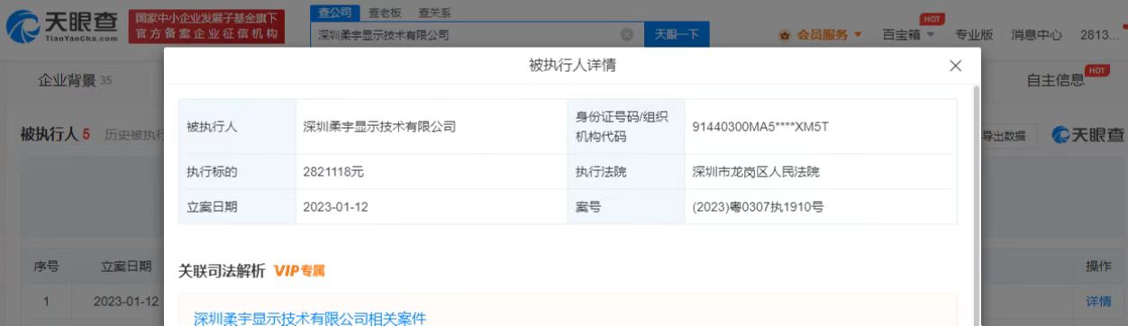 鞭牛士 1月16日消息,天眼查App显示,近日,深圳柔宇显示技术有限公司新增一则被执行人信息,执行标的282万余元,执行法院为深圳市龙岗区人民法院。