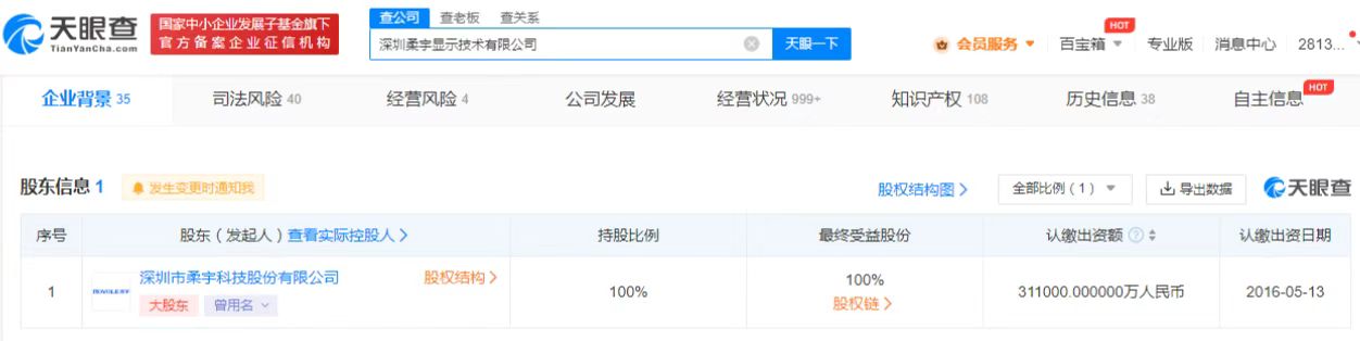 该公司成立于2016年5月,注册资本31.1亿人民币,法定代表人为刘自鸿,由深圳市柔宇科技股份有限公司全资持股。
