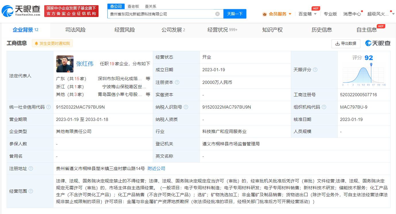 鞭牛士 1月30日消息,天眼查App显示,近日,贵州省东阳光新能源科技有限公司成立,法定代表人为张红伟,注册资本2亿人民币,经营范围包括新材料技术研发、储能技术服务、电子专用材料研发、电子专用材料销售等。