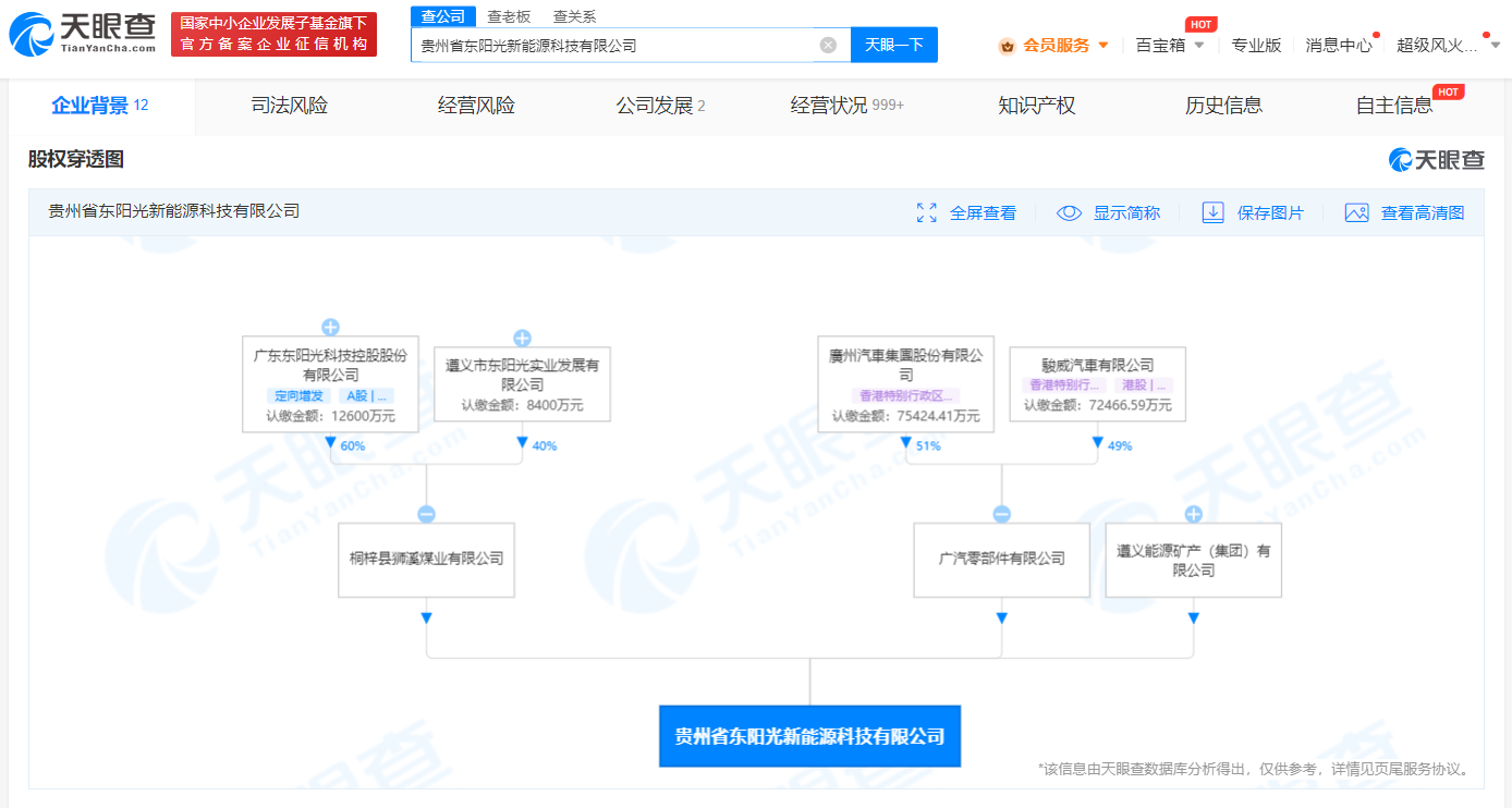 股东信息显示,该公司由广汽零部件有限公司、遵义能源矿产(集团)有限公司、桐梓县狮溪煤业有限公司共同持股,其中桐梓县狮溪煤业有限公司由A股上市公司东阳光(600673)控股。
