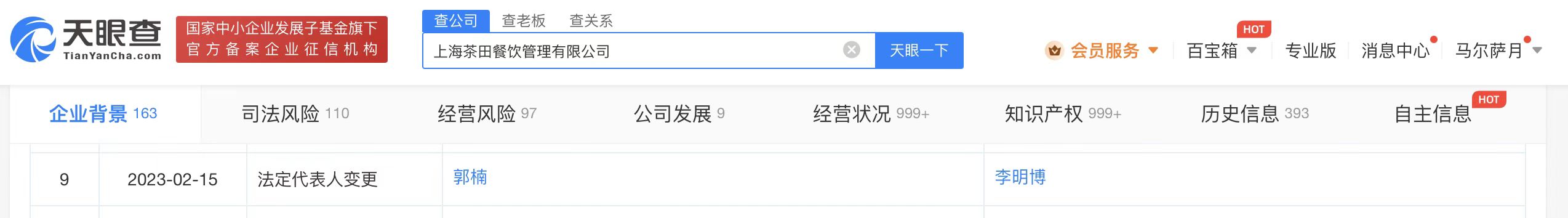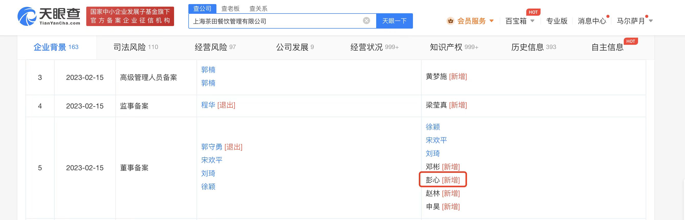 鞭牛士 2月16日消息,天眼查App显示,2月15日,乐乐茶关联公司上海茶田餐饮管理有限公司发生工商变更,法定代表人由郭楠变更为李明博;董事新增奈雪的茶创始人彭心、赵林以及奈雪的茶COO邓彬等;股东新增上海茶祥企业管理咨询中心(有限合伙);公司注册资本由约5089.29万人民币增至约5779.73万人民币,增幅约13.57%。
