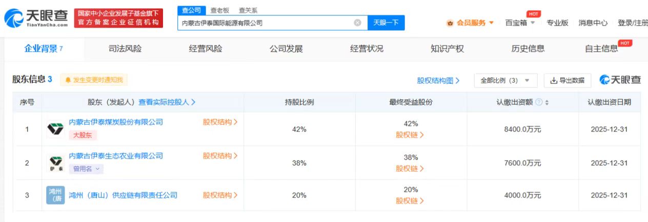 股东信息显示,该公司由鸿州(唐山)供应链有限责任公司、内蒙古伊泰生态农业有限公司、内蒙古伊泰煤炭股份有限公司共同持股。