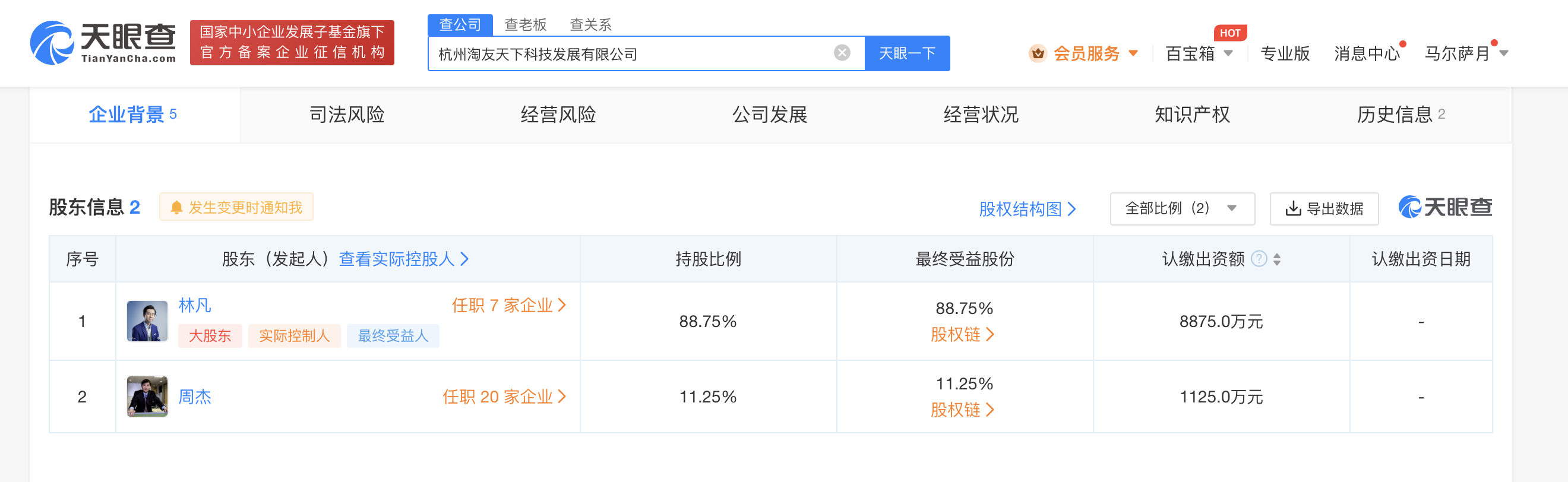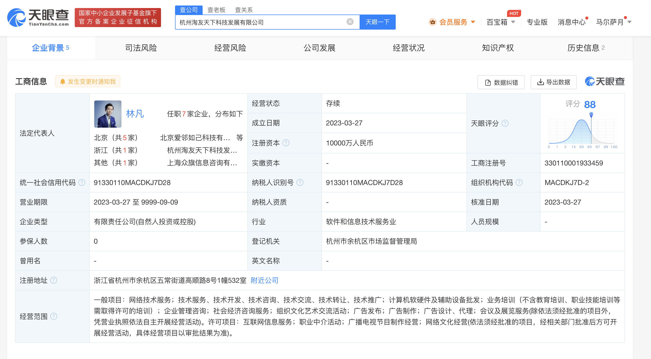 鞭牛士 4月11日消息,天眼查App显示,近日,杭州淘友天下科技发展有限公司成立,注册资本1亿人民币,法定代表人为林凡,经营范围含网络技术服务;计算机软硬件及辅助设备批发;企业管理咨询;社会经济咨询服务;互联网信息服务;职业中介活动等。