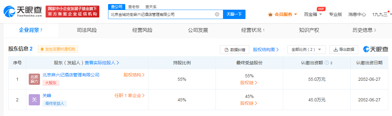 股东信息显示,该公司由北京麻六记酒店管理有限公司和关峰分别持股55%、45%。
