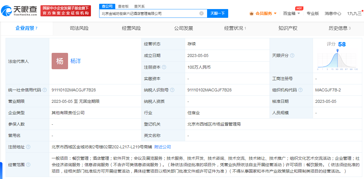 鞭牛士 5月6日消息,天眼查App显示,近日,北京金城坊街麻六记酒店管理有限公司成立,法定代表人杨洋,注册资本100万人民币,经营范围含餐饮管理;酒店管理;软件开发;会议及展览服务等。