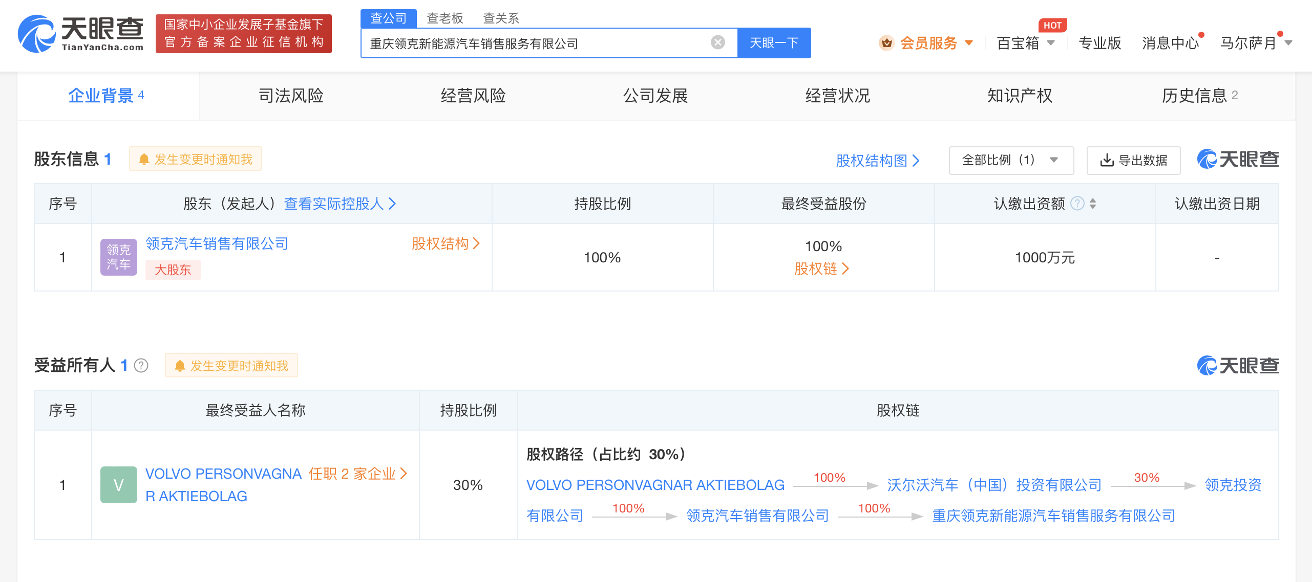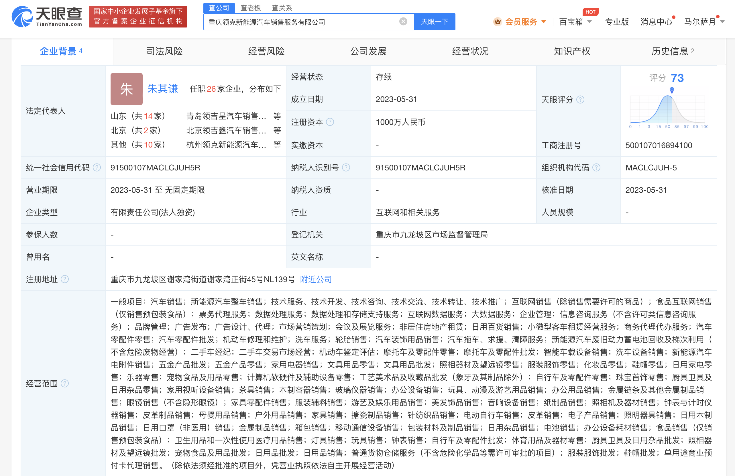 鞭牛士 6月2日消息,天眼查App显示,近日,重庆领克新能源汽车销售服务有限公司成立,法定代表人为朱其谦,注册资本1000万人民币,经营范围含新能源汽车整车销售、食品互联网销售、数据处理服务、小微型客车租赁经营服务、二手车经纪等。股东信息显示,该公司由领克汽车销售有限公司全资持股。