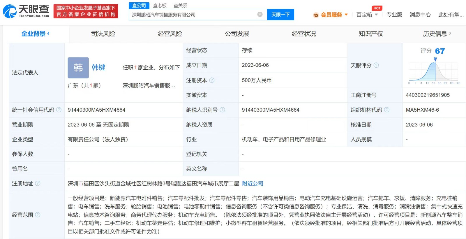 鞭牛士 6月8日消息,天眼查App显示,近日,深圳鹏昭汽车销售服务有限公司成立,法定代表人为韩键,注册资本500万人民币,经营范围含新能源汽车电附件销售;电动汽车充电基础设施运营;汽车拖车、求援、清障服务等。