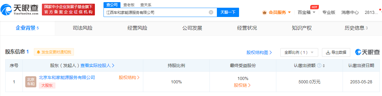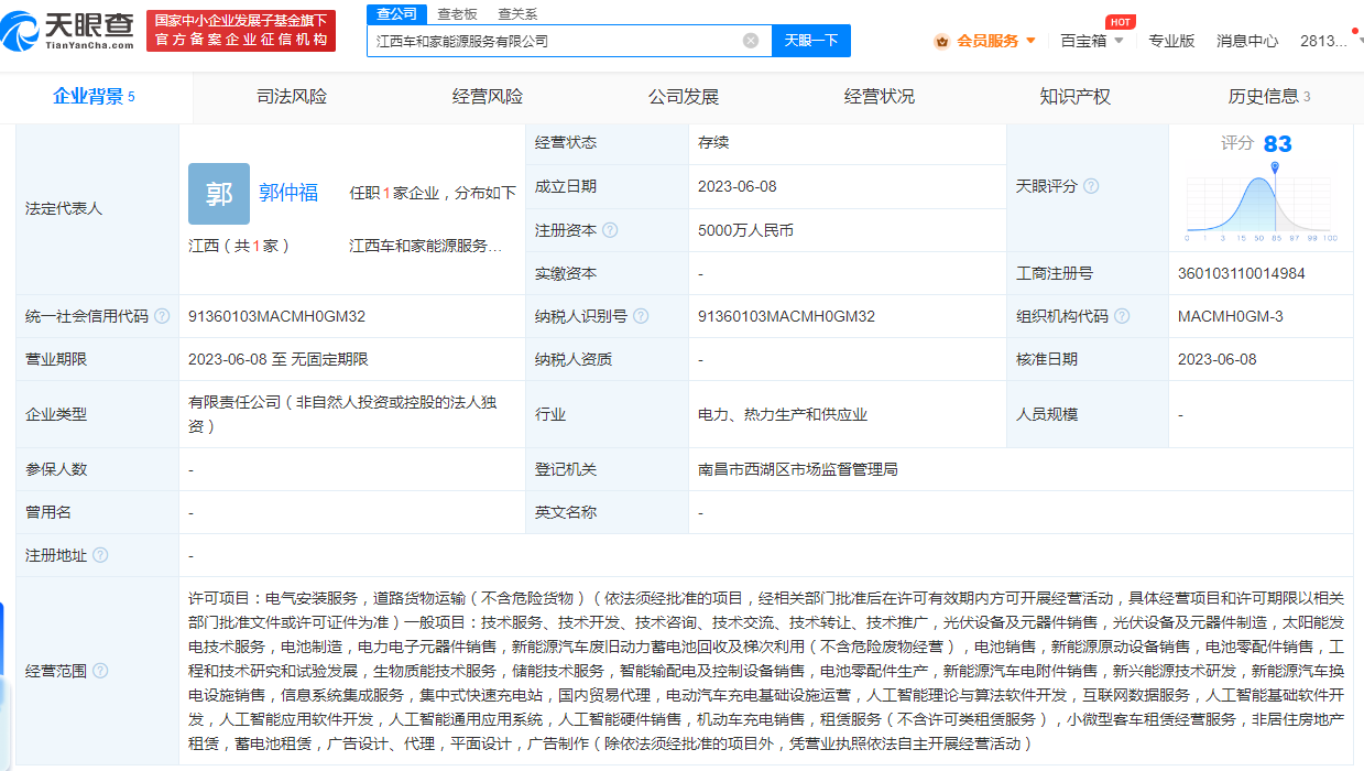 天眼查App显示,近日,江西车和家能源服务有限公司成立,法定代表人为郭仲福,注册资本5000万人民币,经营范围含光伏设备及元器件销售;电池制造;电力电子元器件销售;新兴能源技术研发;人工智能基础软件开发等。