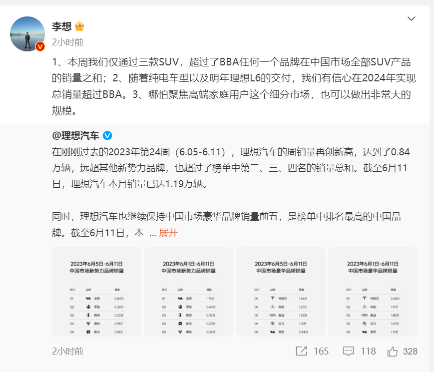 6月9日,理想汽车CEO李想也在微博发文称,“1、本周我们仅通过三款SUV,超过了BBA任何一个品牌在中国市场全部SUV产品的销量之和;2、随着纯电车型以及明年理想L6的交付,我们有信心在2024年实现总销量超过BBA。3、哪怕聚焦高端家庭用户这个细分市场,也可以做出非常大的规模。”