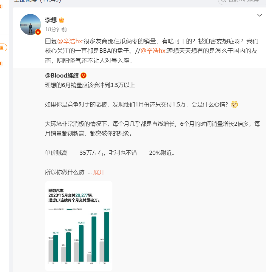 李想对此回应称:“很多友商那仨瓜俩枣的销量,有啥可干的?被迫害妄想症呀?我们核心关注的一直都是BBA的盘子。”