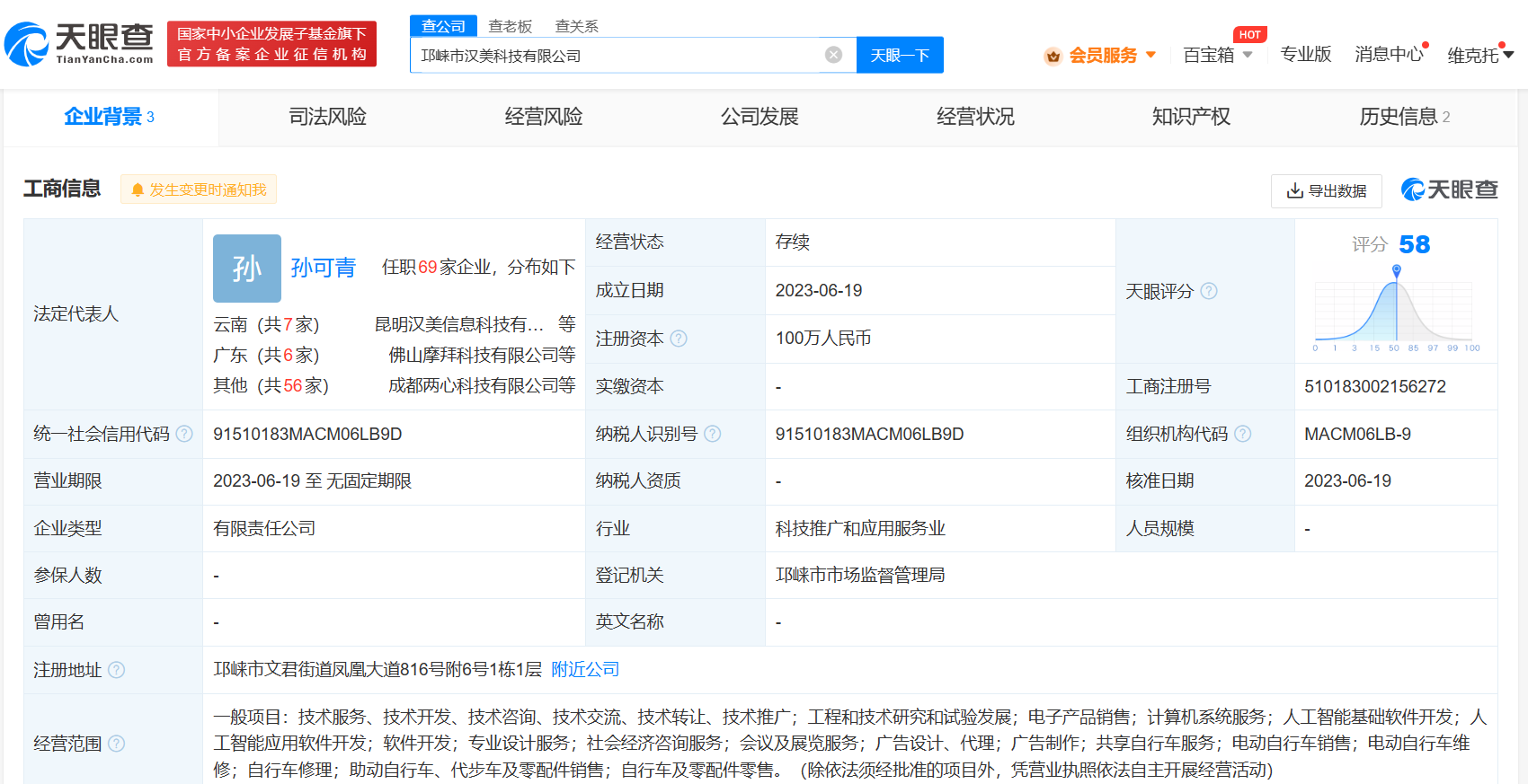 天眼查App显示,近日,邛崃市汉美科技有限公司成立,法定代表人为孙可青,注册资本100万人民币,经营范围包括工程和技术研究和试验发展、电子产品销售、计算机系统服务、人工智能应用软件开发、共享自行车服务、电动自行车销售等。
