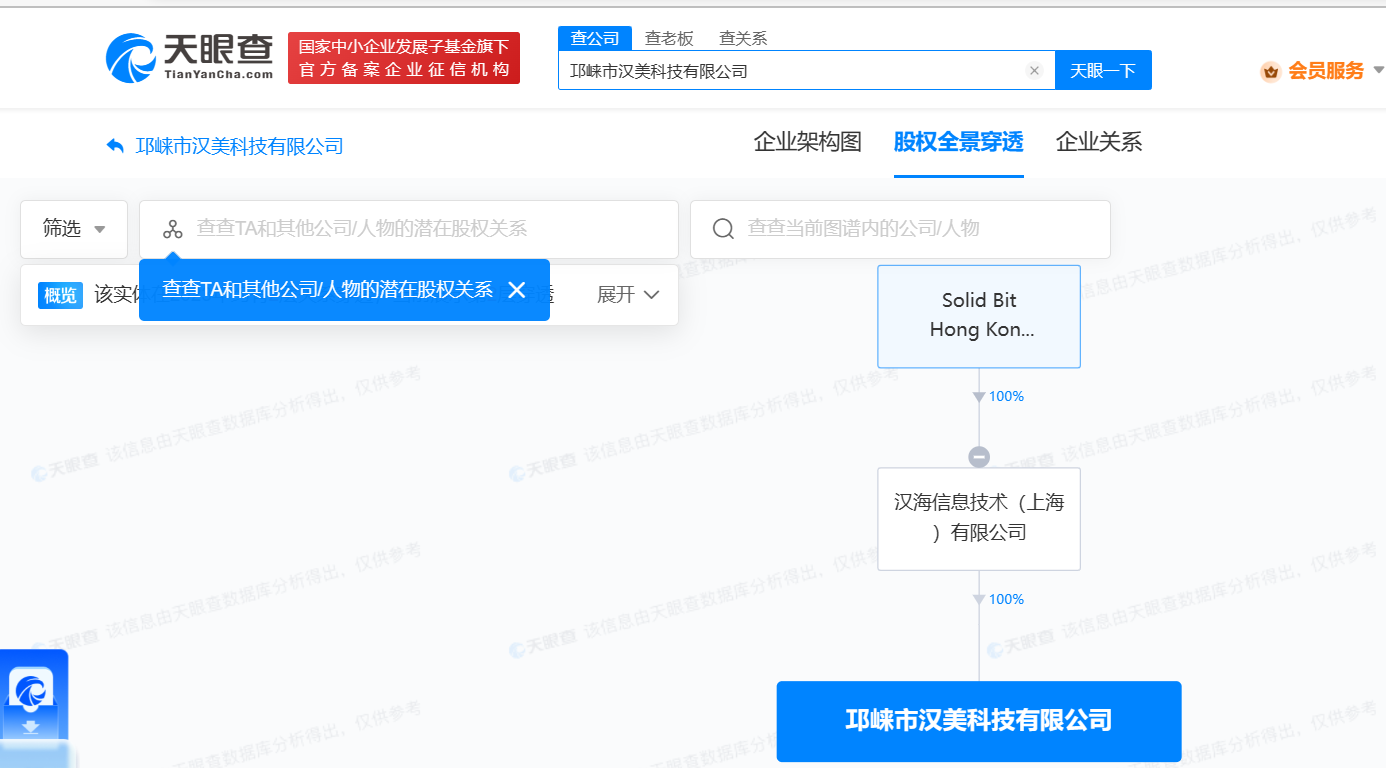 股权全景穿透图显示,该公司由美团旗下Solid Bit Hong Kong Limited间接全资持股。