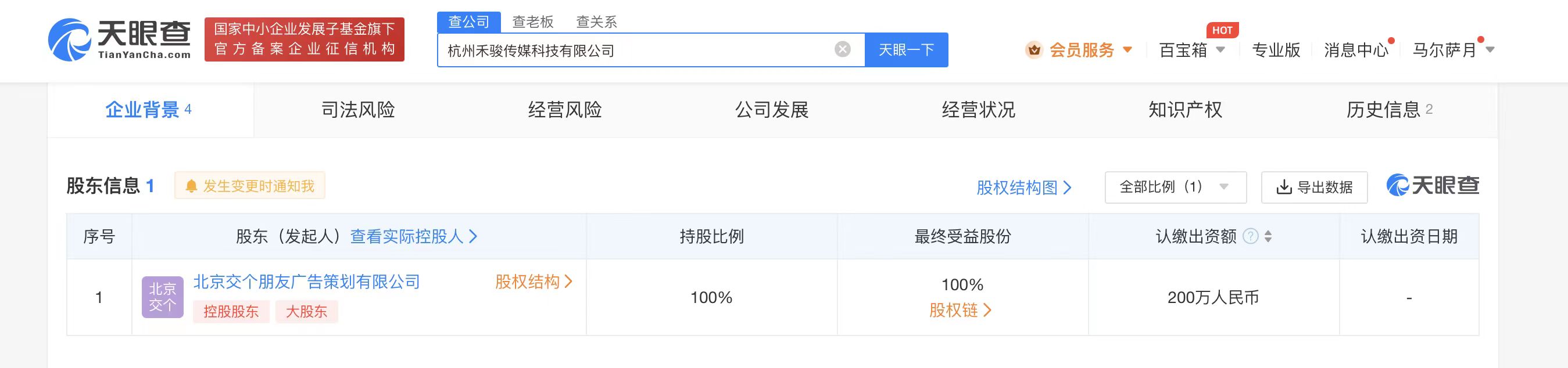 天眼查App显示,近日,杭州禾骏传媒科技有限公司成立,法定代表人为赵慧利,注册资本200万人民币,经营范围含技术服务、组织文化艺术交流活动、企业形象策划、广告制作、专业设计服务、广播电视节目制作经营等。