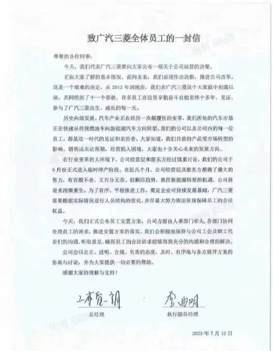 该全员信由广汽三菱总经理山本贤一朗、执行副总经理李曲明发布。