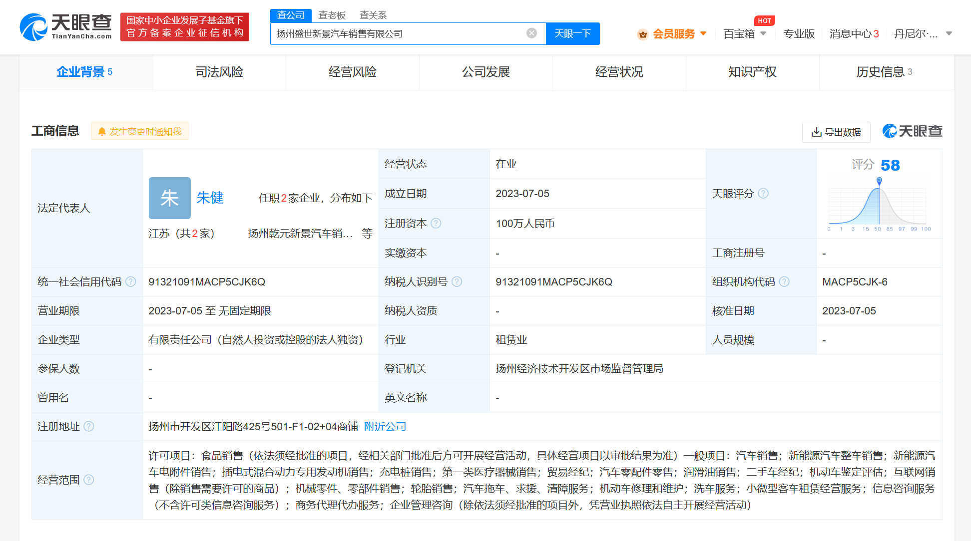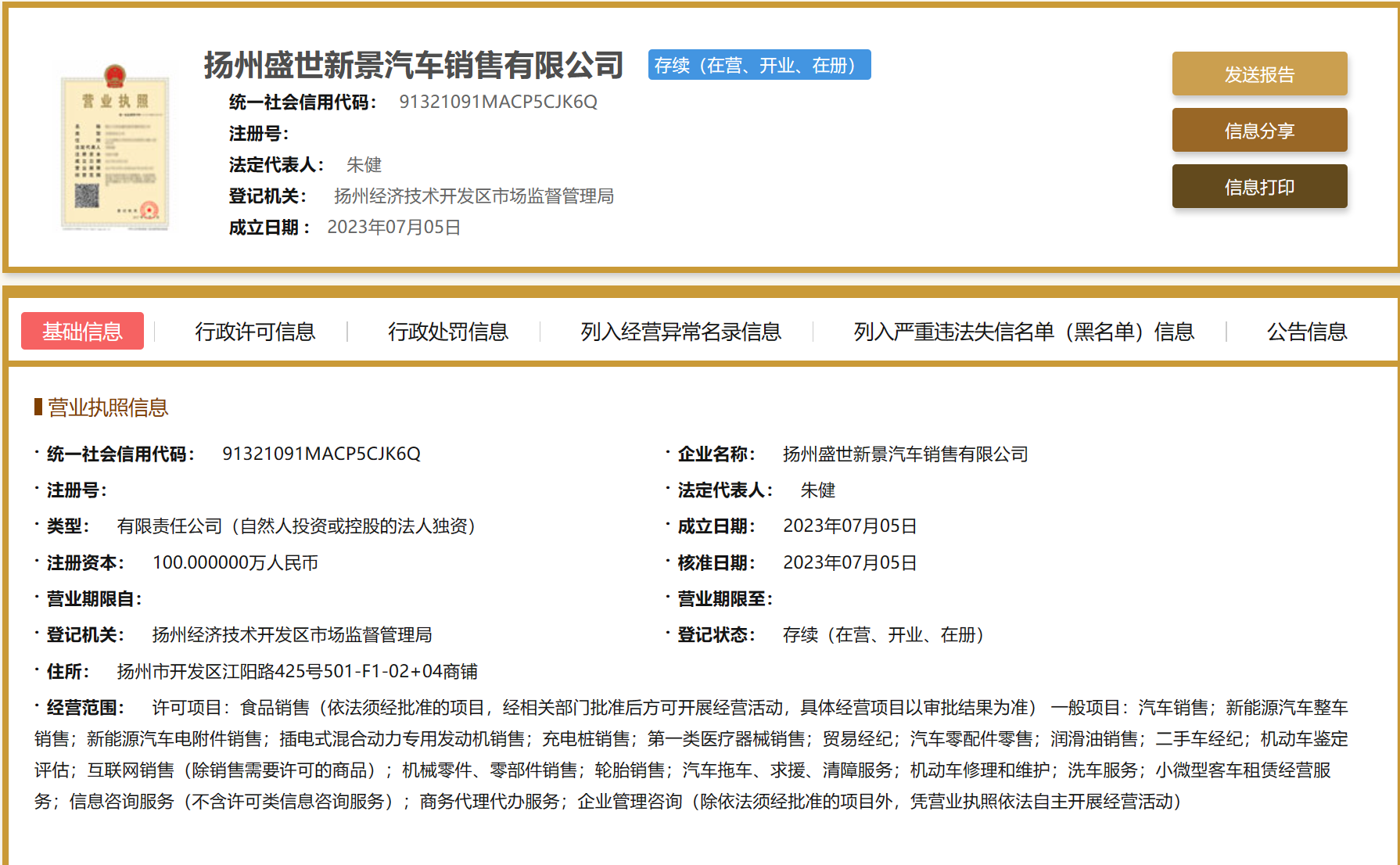 天眼查App显示,近日,扬州盛世新景汽车销售有限公司成立,法定代表人为朱健,注册资本100万人民币,经营范围包括新能源汽车整车销售、新能源汽车电附件销售、充电桩销售、二手车经纪等。