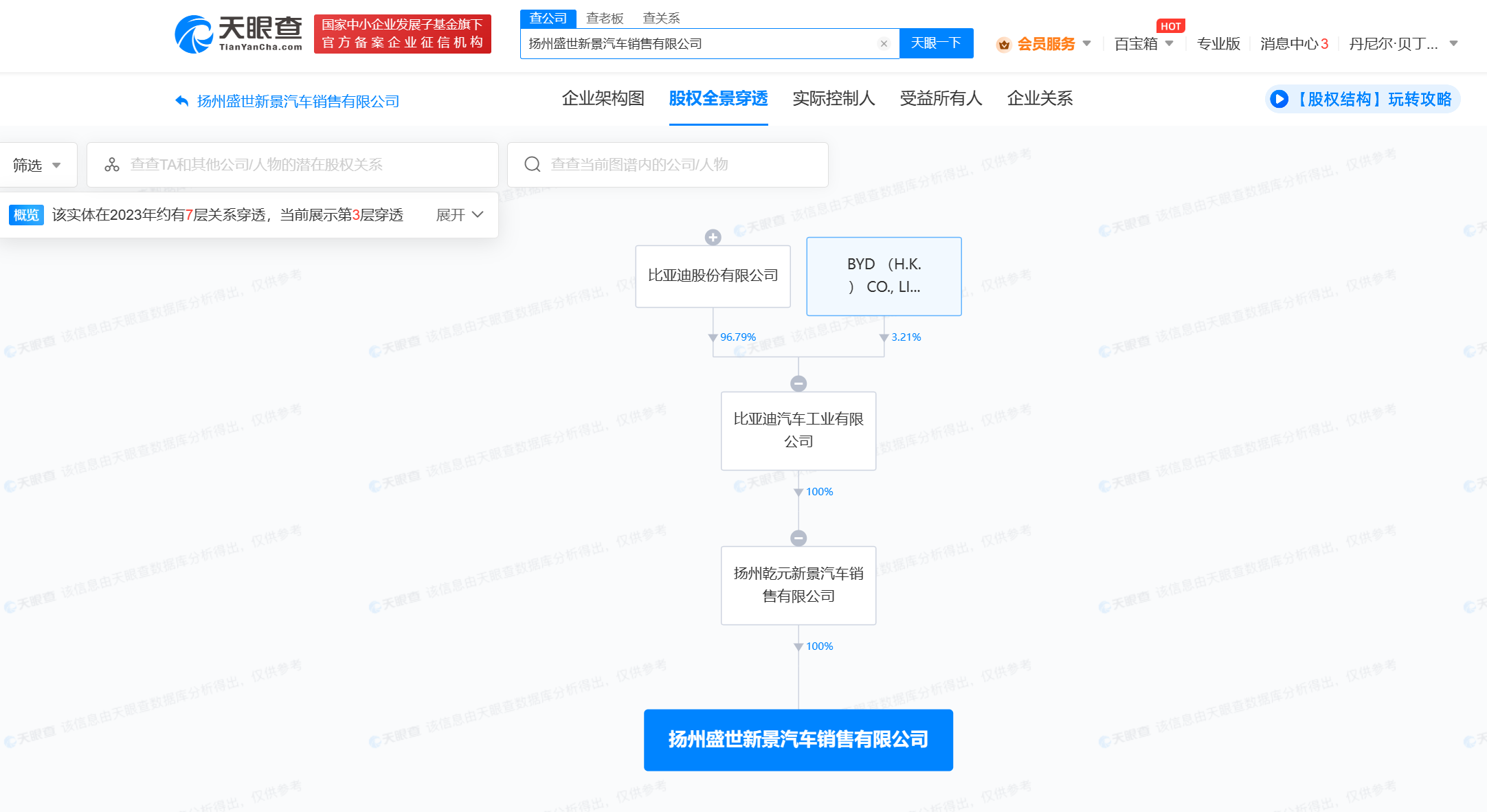 股权全景穿透图显示,该公司由比亚迪汽车工业有限公司间接全资持股。