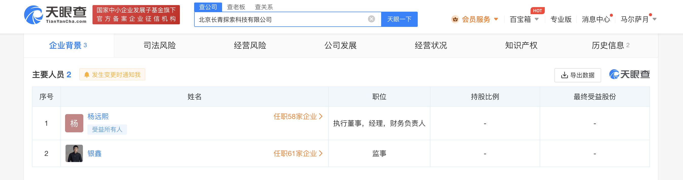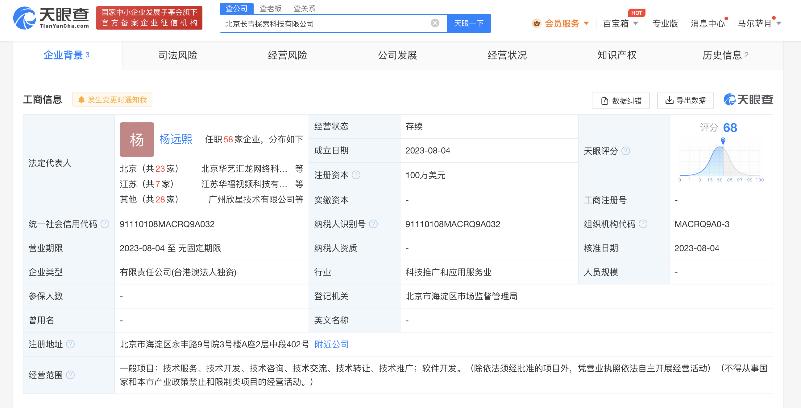 天眼查App显示,近日,北京长青探索科技有限公司成立,注册资本100万美元,法定代表人、执行董事、经理及财务负责人为快手联合创始人杨远熙,监事为快手联合创始人银鑫,经营范围含技术服务、技术开发、软件开发等。