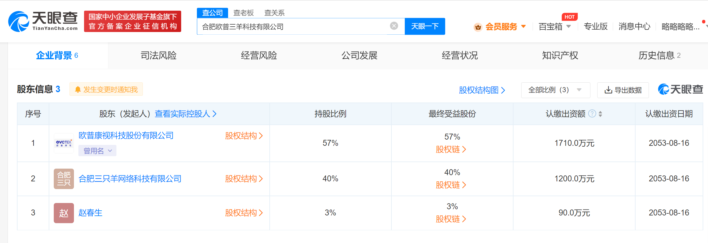 股东信息显示,该公司由欧普康视(300595)、合肥三只羊网络科技有限公司、赵春生分别持股57%、40%、3%。