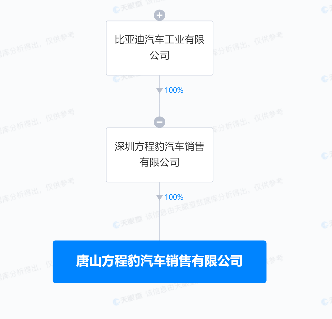 股权全景穿透图显示,该公司由深圳方程豹汽车销售有限公司全资持股,后者为比亚迪汽车工业有限公司全资子公司。