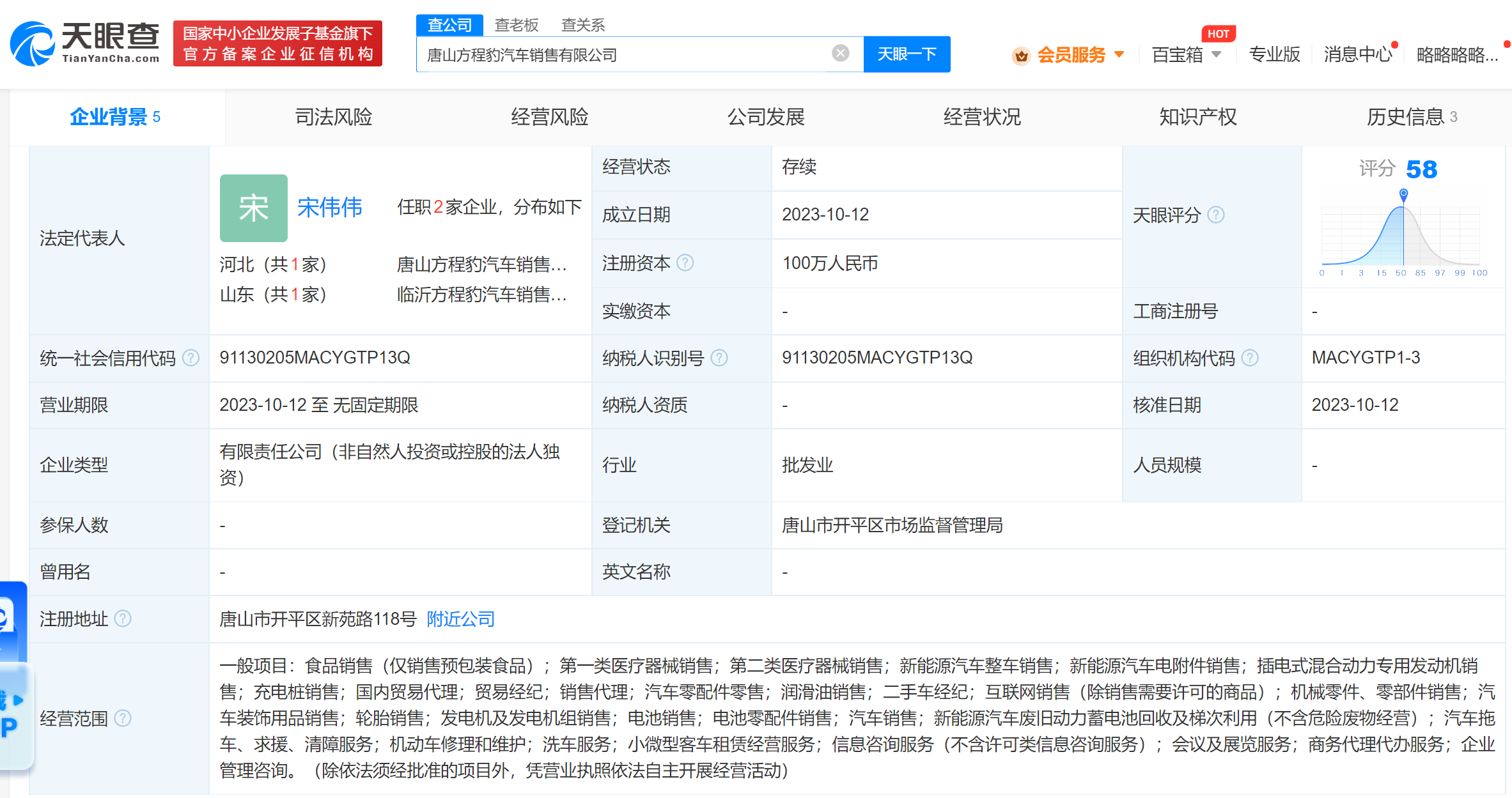 天眼查App显示,近日,唐山方程豹汽车销售有限公司成立,法定代表人为宋伟伟,注册资本100万人民币,经营范围含新能源汽车整车销售、汽车销售、二手车经纪、互联网销售、充电桩销售等。