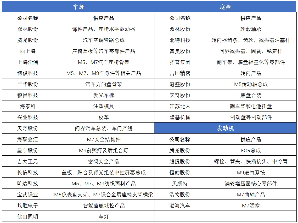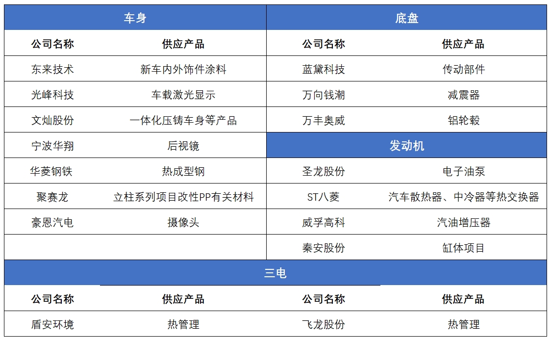 由于问界系列汽车包含纯电和混动(增程式)两种车型,因此,我们按照车身、底盘、发动机、三电及其他几个大部分,分别梳理对应的汽车供应商,部分供应商会同时为问界汽车供应多个部件,名单也会有所重合。