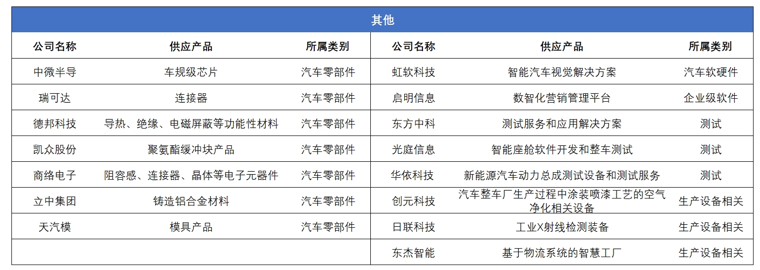 最后,也有一些企业表示与赛力斯有合作,但是并没有明确披露具体的合作产品和合作方向,这些企业中,有知名的软件服务企业软通动力,也有汽车制动龙头伯特利。华昌达、派斯林则主要为汽车工厂相关的服务商。