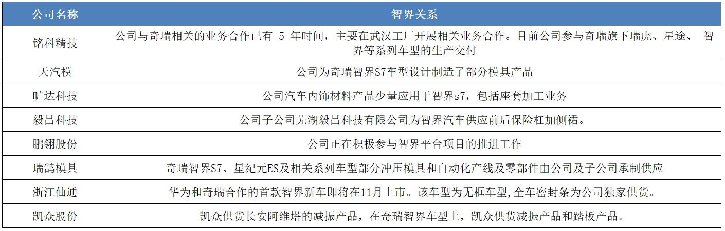 在奇瑞方面,其与华为合作的智界S7轿车将于近期发布,目前也有几家供应商在投资者交流平台表示向智界供货。