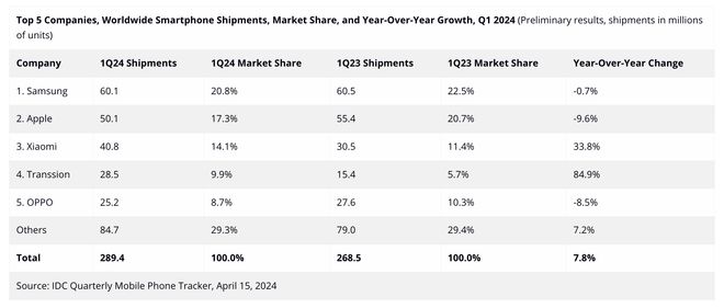 鞭牛士 4月15日消息,据IDC数据,苹果今年第一季度iPhone出货量下降了9.6%,市场份额为17.3%。三星居榜首,份额为20.8%。