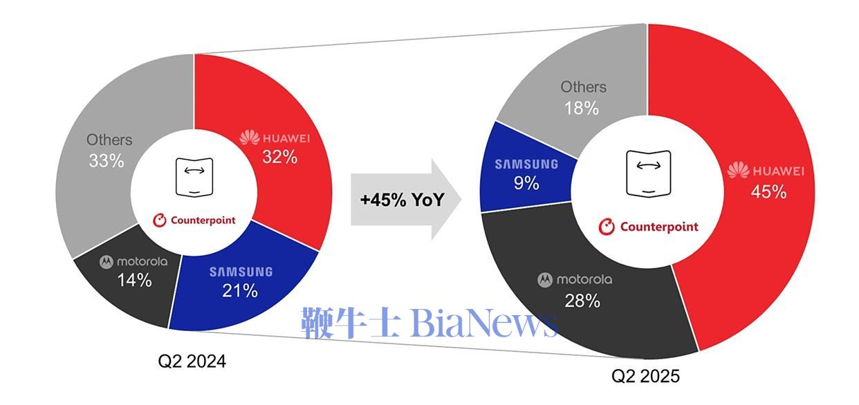 机构:华为夺Q2折叠手机全球出货第一,占据45%市场