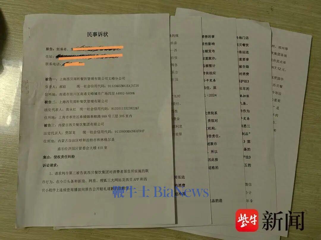 郭乘希本身就是一名律师,9月26日,她以 “侵权责任纠纷” 为由,将上海西贝周昕餐饮管理有限公司文峰分公司、上海西贝周昕餐饮管理有限公司、内蒙古西贝餐饮集团有限公司诉至崇川区人民法院,主张三被告存在虚假宣传、侵害消费者知情权等行为,相关诉讼材料及证据已正式提交。