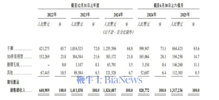 高增长背后是渠道扩张与品类的延伸。截至2025年9月,TOP TOY门店数量达299家,并出海泰国、日本等国家。在品类上,主要包括手办、积木(3D拼装模型)、搪胶毛绒三大类,2025上半年收入分别约8.64亿、1.94亿、1.46亿元,占比分别为65.6%、14.7%和11.1%,仍然以手办为主,但搪胶毛绒增速很快。