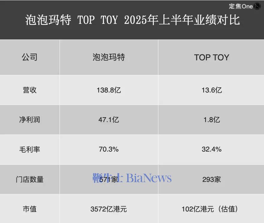 对比之下,泡泡玛特市值一度突破4000亿港元大关。截至2025年9月26日港股收盘,其市值3572亿港元,约等于35个TOP TOY、6.5个名创优品(市值545亿港元)。