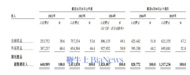 招股书显示,2022年-2024年及2025年上半年,名创优品渠道销售收入分别为2.5亿元、7.81亿元、9.23亿元及6.19亿元,占比为36.8%、53.5%、48.3%及45.5%。