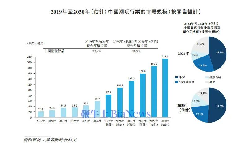 弗若斯特沙利文数据显示,中国潮玩市场近几年保持着高速增长,2025年市场规模预计达到825亿元,到2030年有望增至2133亿元,年均复合增长率高达20.9%。潮玩想象空间巨大,但竞争门槛也越来越高。