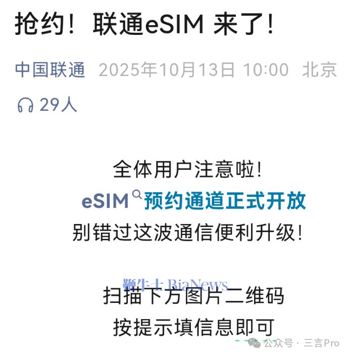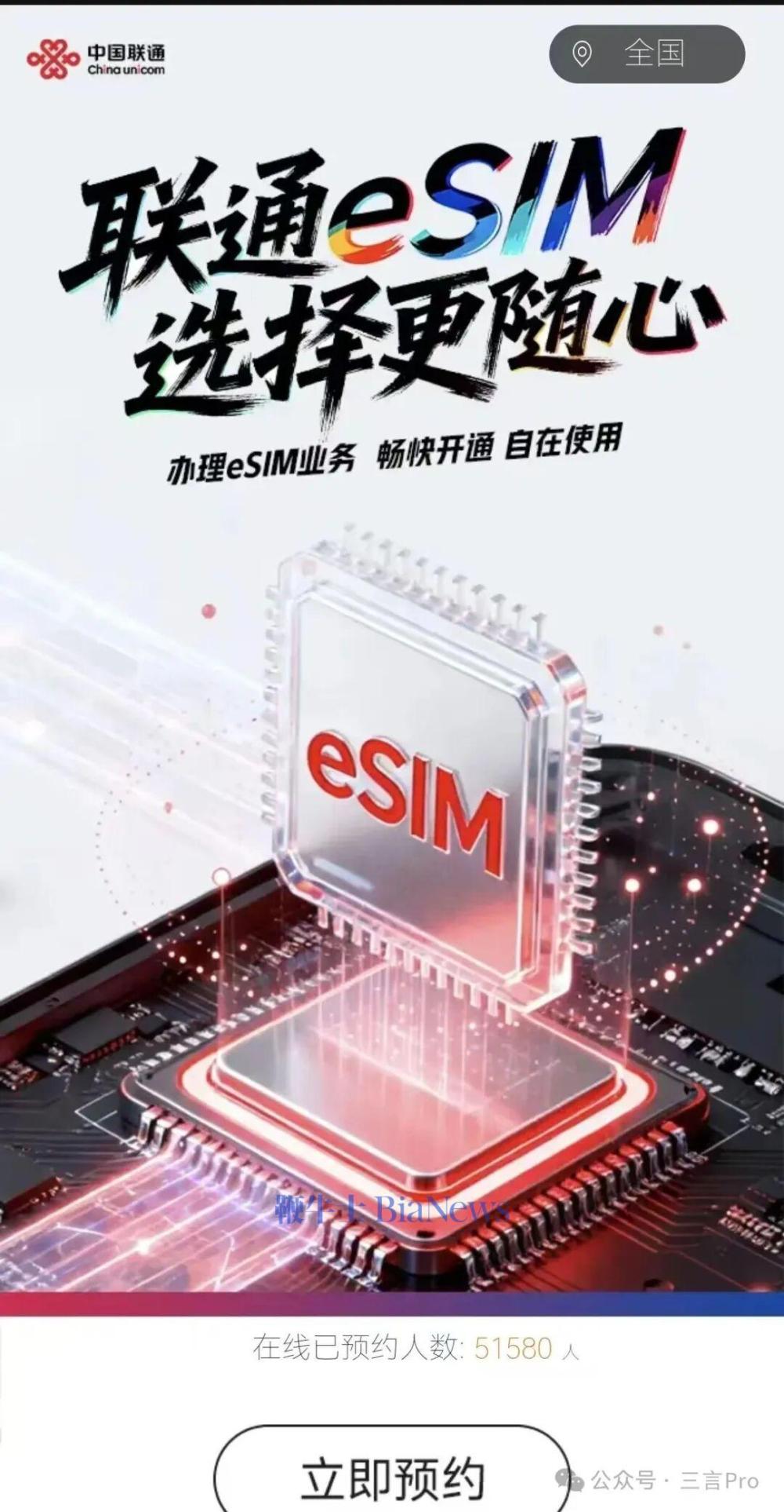 10月13日,中国联通官宣eSIM预约通道正式开放。