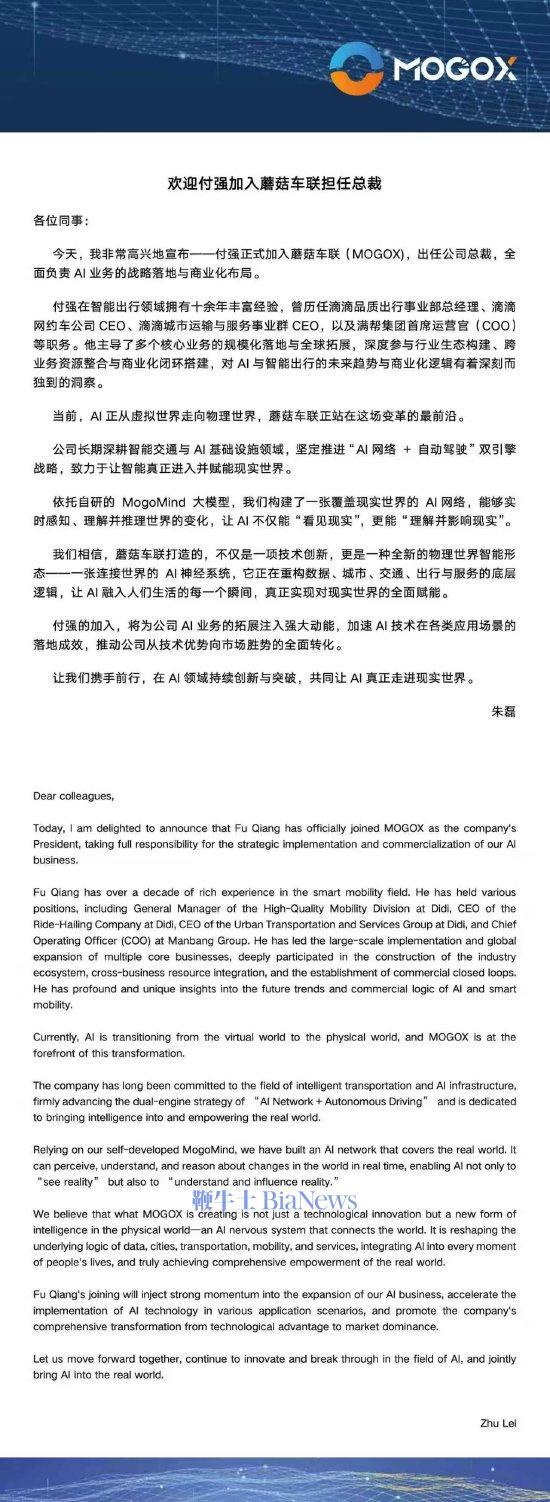 今日,蘑菇车联创始人兼CEO朱磊发布内部公开信,前滴滴高级副总裁付强正式加入蘑菇车联出任公司总裁,全面负责AI业务的战略落地与商业化布局。