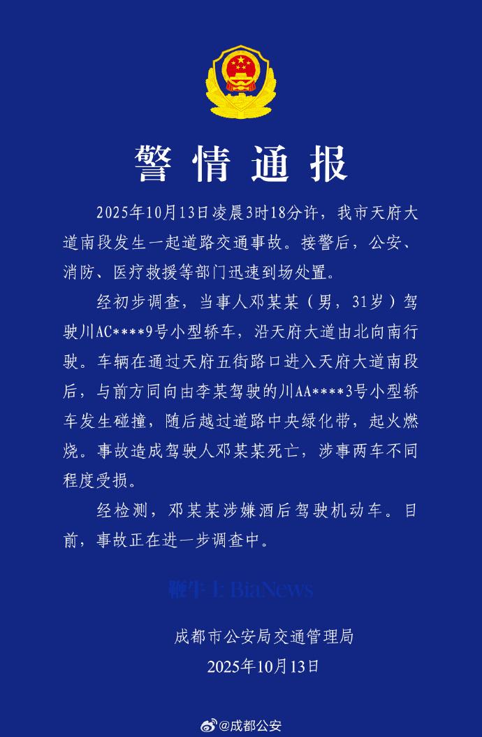 今天下午,成都市公安局交通管理法发布警情通报:2025年10月13日凌晨3时18分许,该市天府大道南段发生一起道路交通事故。接警后,公安、消防、医疗救援等部门迅速到场处置。