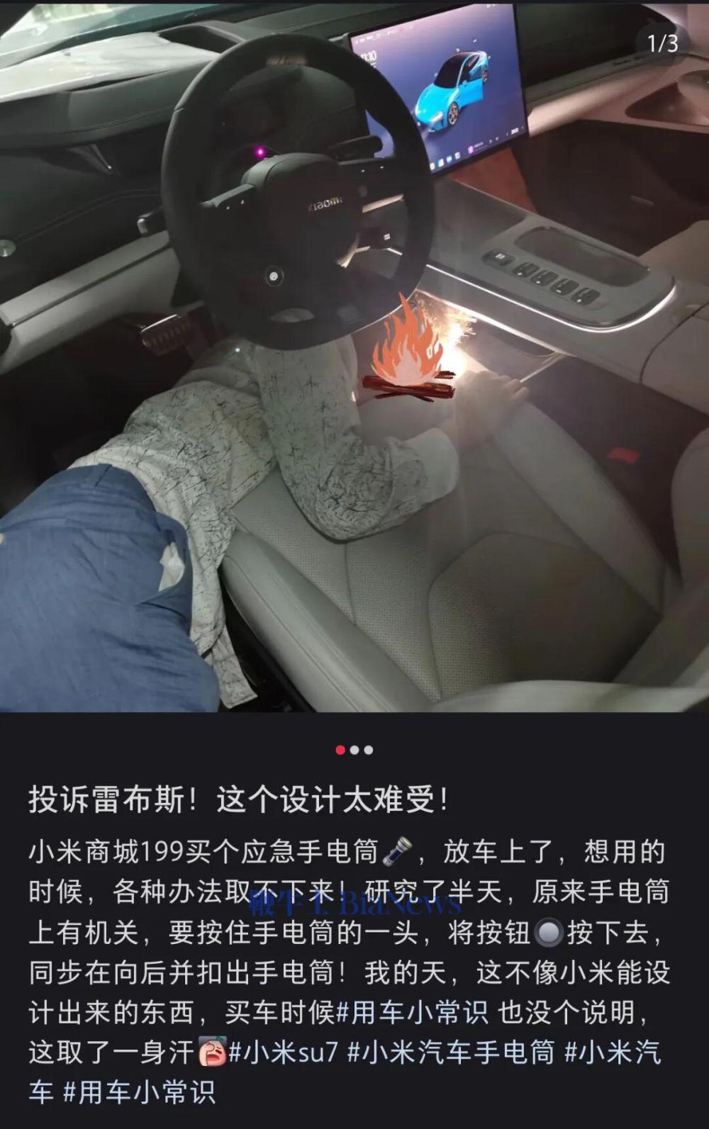 不过,上述车主称,自己无意中发现小米汽车上手电筒卡扣设计存在问题,导致用户将手电筒安装在卡扣里后,却无法轻易取出。