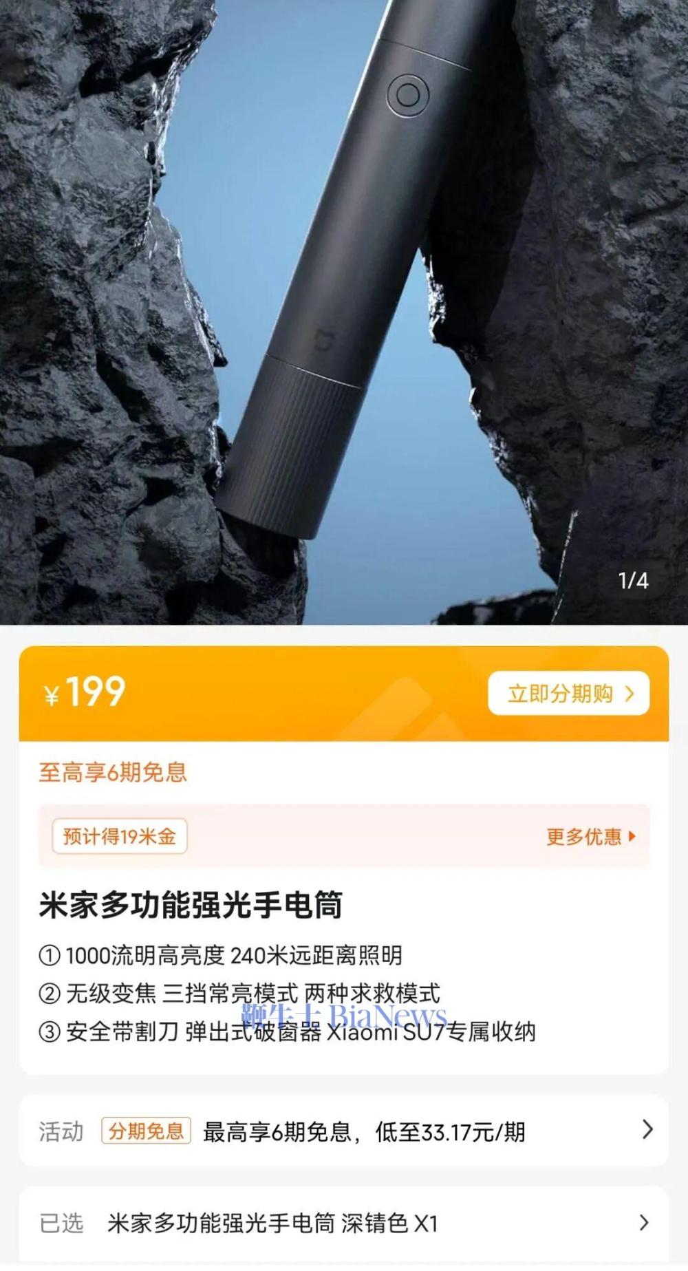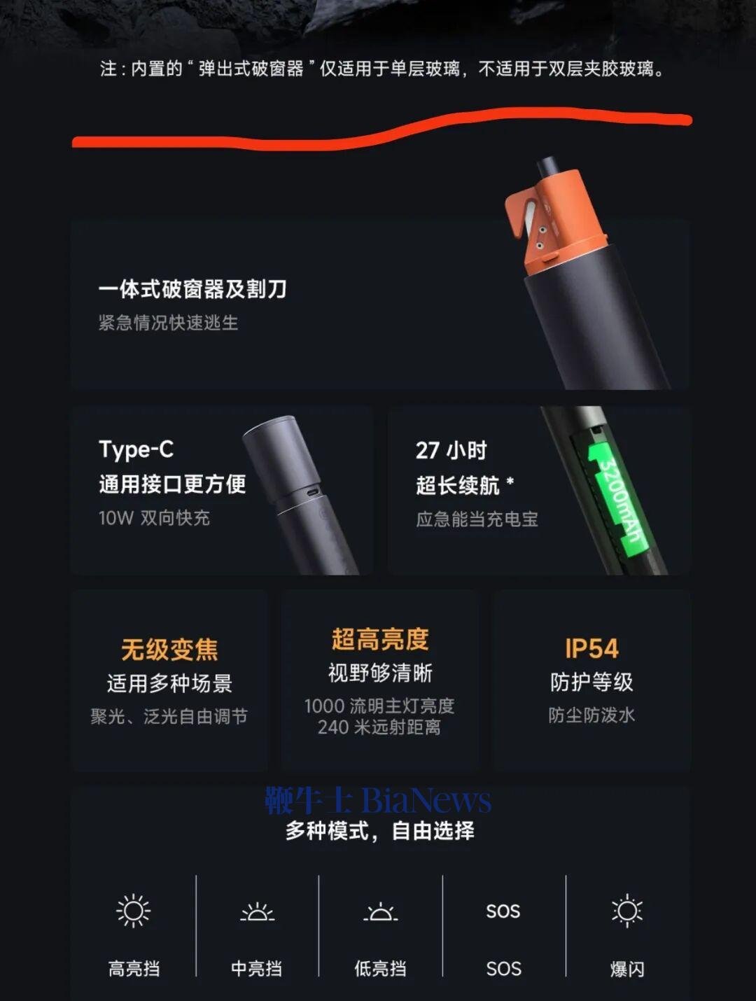据悉,“米家多功能强光手电筒”售价199元,除了具备强光手电功能外,还有破窗、安全带切割等功能。