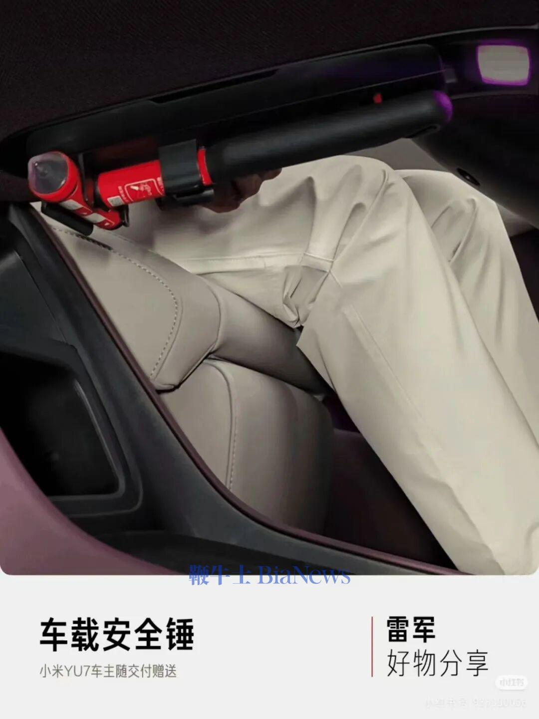 小米YU7方面,雷军曾特别介绍过YU7随车附赠的破窗安全锤,该安全锤可以专门安置在YU7中控扶手台下方卡扣处。