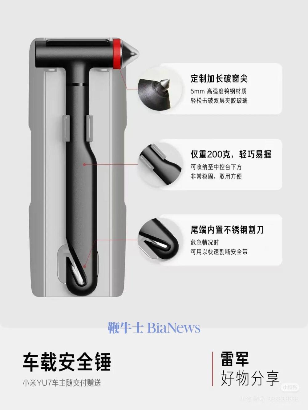 不过,目前YU7的安全锤暂未在小米官方渠道开售,仅随车附赠。(转载自三言科技)